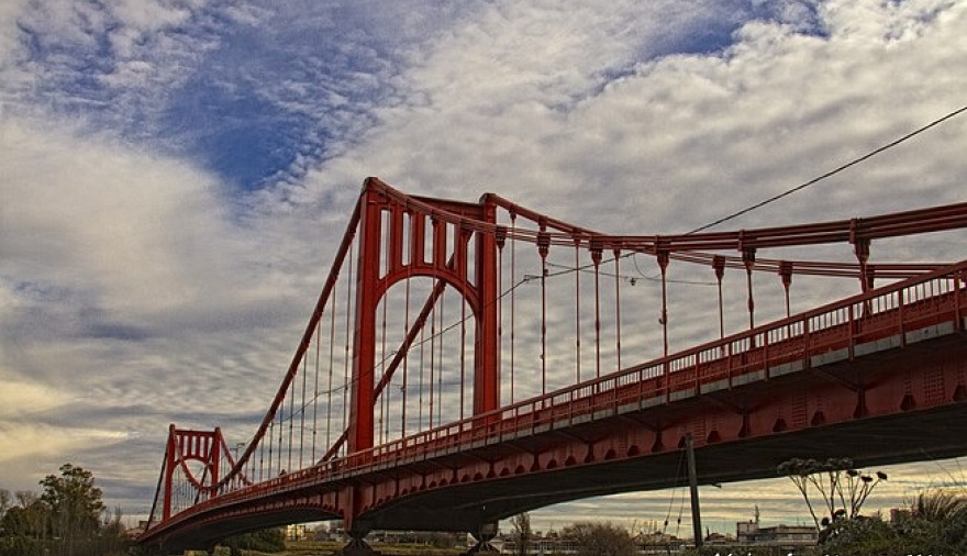 Como se sabe, es uno de los símbolos del núcleo urbano Necochea – Quequén, en el sudeste de la Provincia de Buenos Aires. El Puente Colgante Hipólito Yrigoyen es un puente que cruza el Río Quequén Grande. Une a las ciudades de Necochea y Quequén. El puente tiene un largo total de 270 metros y un vano central de 150 metros de luz, así como otros dos vanos laterales de 60 m. La estructura está suspendida por 32 cables que la sujetan desde 2 pórticos metálicos de 25,7 m de altura, apoyados sobre 4 ejes.
