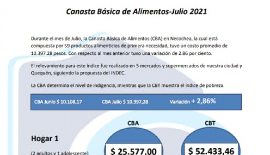 Durante el mes de julio la Canasta Básica de Alimentos (CBA) de Necochea mostró una suba de precios del 2,86 por ciento con respecto a junio, según informa el índice realizado por la Consultora Bicentenario.