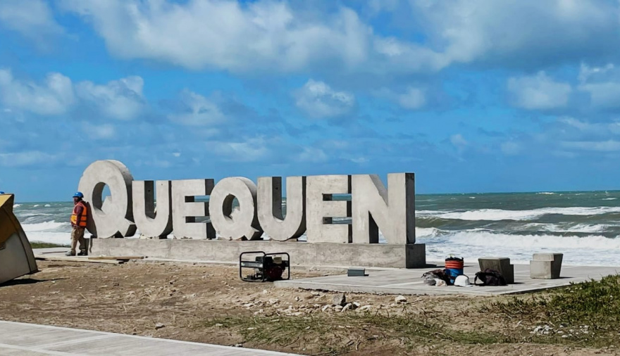 En el marco de la obra de remodelación integral de la Avenida 502 en Quequén, gestionada en Nación por el intendente Arturo Rojas, continúa a muy buen ritmo. En este marco, y amén de la colocación de las veredas, decks de madera y luces LED, hoy se terminaron de instalar las letras que determinan la palabra Quequén, conformando un imponente cartel que da al mar.