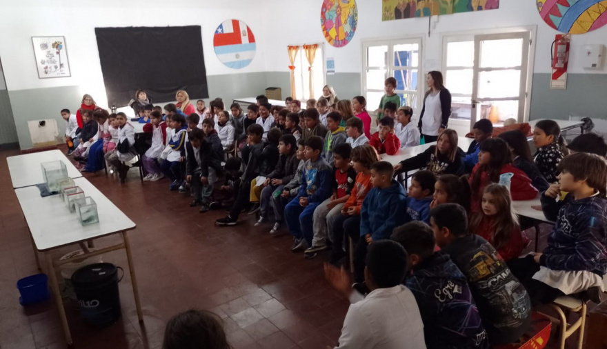 En esta oportunidad, alumnos, docentes y la directora del establecimiento, Silvina Panarese, recibieron a los técnicos de la Estación de Piscicultura, encargados de llevar adelante las charlas, Naschel Caro Petersen y César Colatriano, quienes acercaron ejemplares autóctonos del Río Quequén, como bagre y mojarras, y especies del acuario, como axolotes y langostas australianas”.