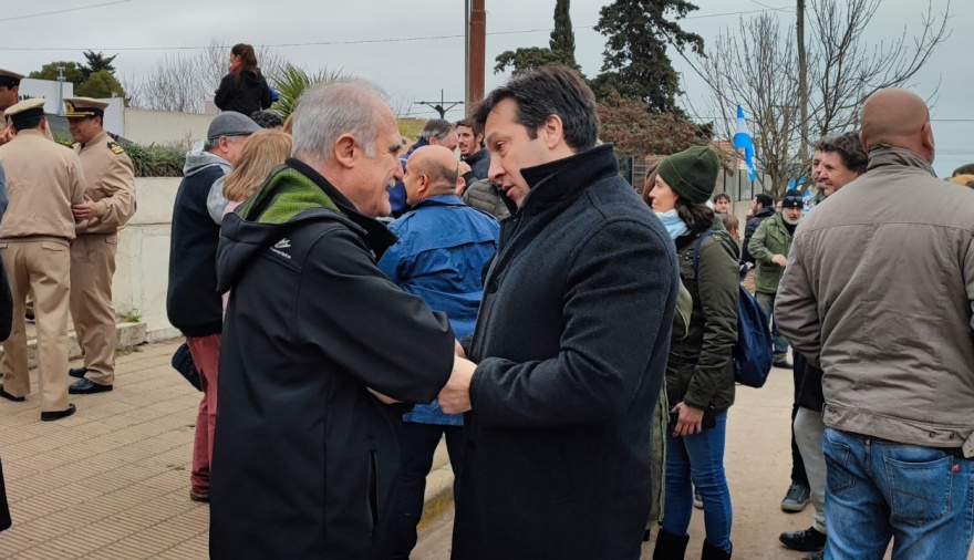 El presidente del Consorcio de Gestión de Puerto Quequén, Jorge Álvaro, y el gerente general, Oscar Morán, junto a la comunidad en el acto del aniversario de Quequén.