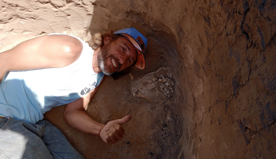 Agregó “tenía la cabeza sobre un borde de la zanja en el fondo, medía 1 metro 28 centímetros, no podía ser una persona por suerte ni tampoco una vaca o un perro. A lo encontrado lo cubrí con un silo bolsa que tenía. Ahora, por el momento, tengo la obra parada en mi casa, hay que tener paciencia”.