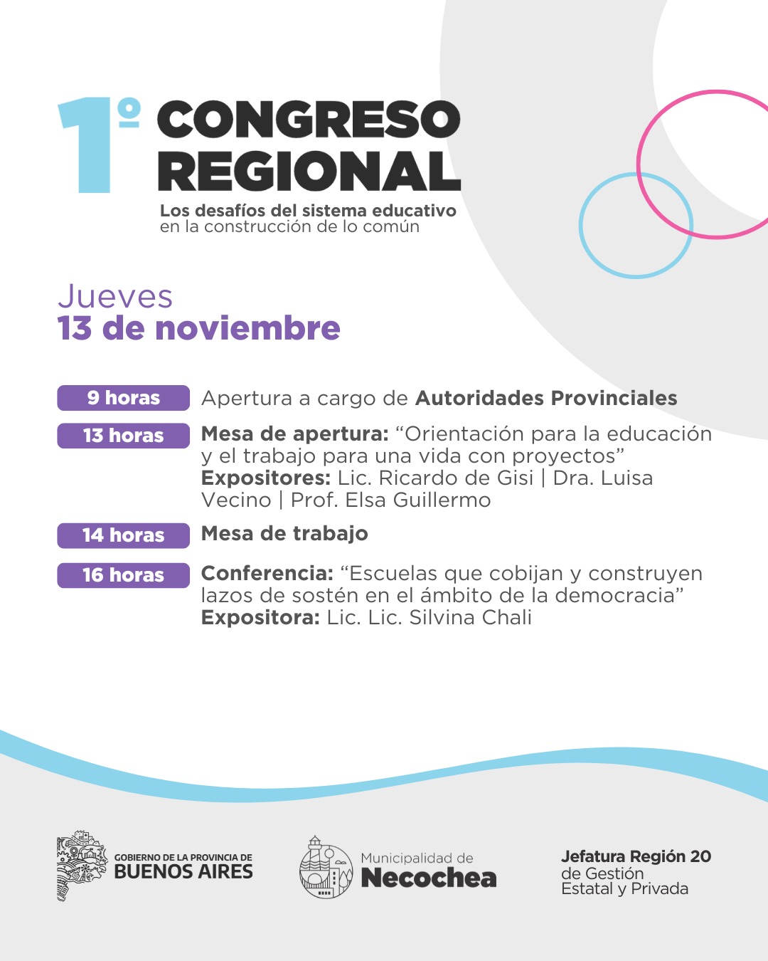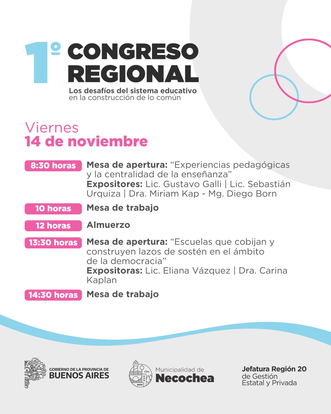 Vale destacar que el 1º Congreso Regional contará con la participación y experiencia de muchos de los directos provinciales del sistema educativo, como Carina Kaplan; la directora provincial de Psicología Comunitaria y Pedagogía Social, Eliana Vázquez; el Lic. Ricardo de Gisi; la Dra. Luisa Vecino; la Prof. Elsa Guillermo; el Lic. Gustavo Galli; el Lic. Sebastián Urquiza; la Dra. Miriam Kap; el Mg. Diego Born y la Lic. Silvina Chali, entre otros.