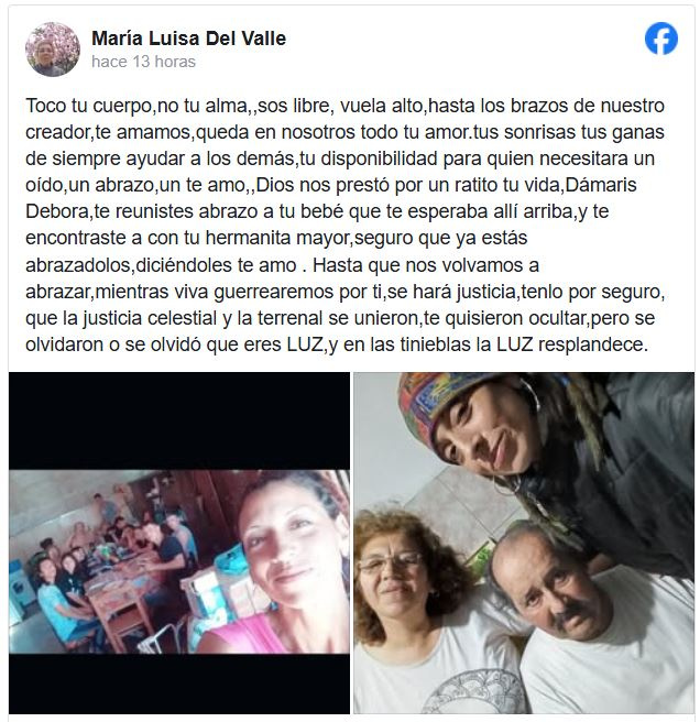 “Hasta que nos volvamos a encontrar. Tocó tu cuerpo, no tu alma. Sos libre, volá alto hasta los brazos de nuestro creador. Te amamos y queda en nosotros todo tu amor, tus sonrisas y tus ganas de siempre ayudar a los demás”, escribió la mujer en su cuenta de Facebook, acompañando sus palabras con fotos familiares junto a Débora.