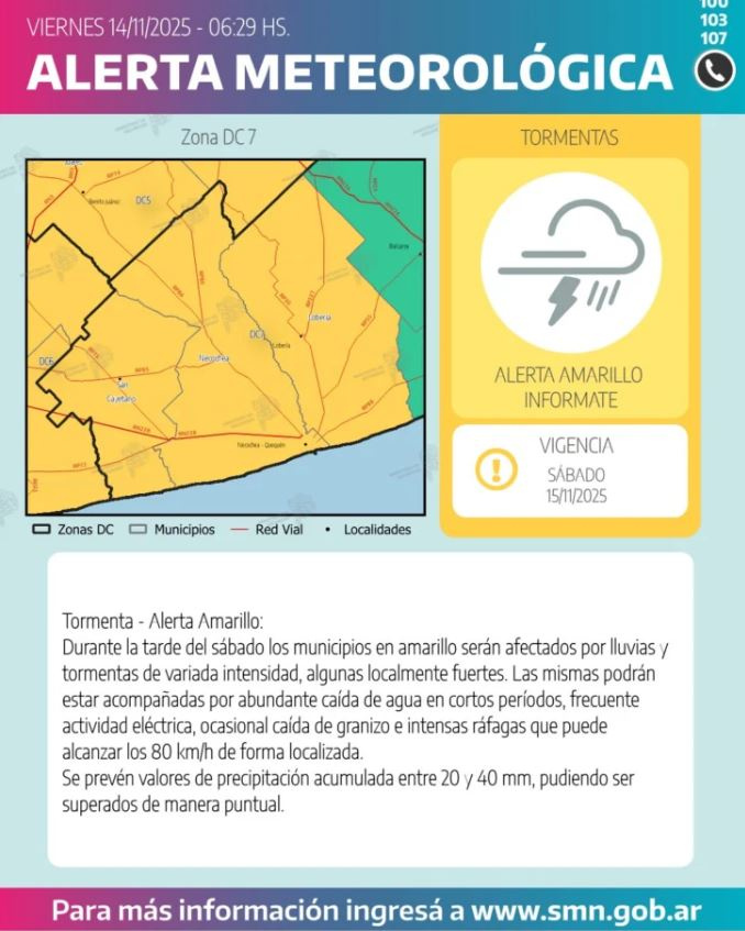 Según el reporte, durante la tarde del sábado se esperan lluvias y tormentas de variada intensidad, algunas podrían ser localmente fuertes. Los acumulados de lluvia estimados se ubican entre 20 y 40 milímetros, con posibilidad de superar esos valores en zonas puntuales.