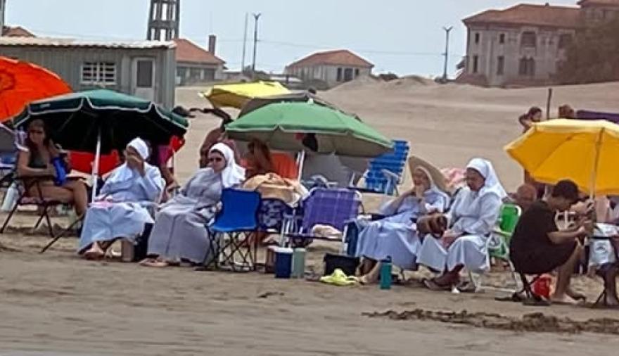 Pero entre sombrillas, reposeras y familias buscando refrescarse, una escena poco habitual llamó la atención de todos: cuatro monjas vestidas de blanco se instalaron sobre la arena y disfrutaron de la tarde frente al mar, regalando una postal tan inesperada como simpática.