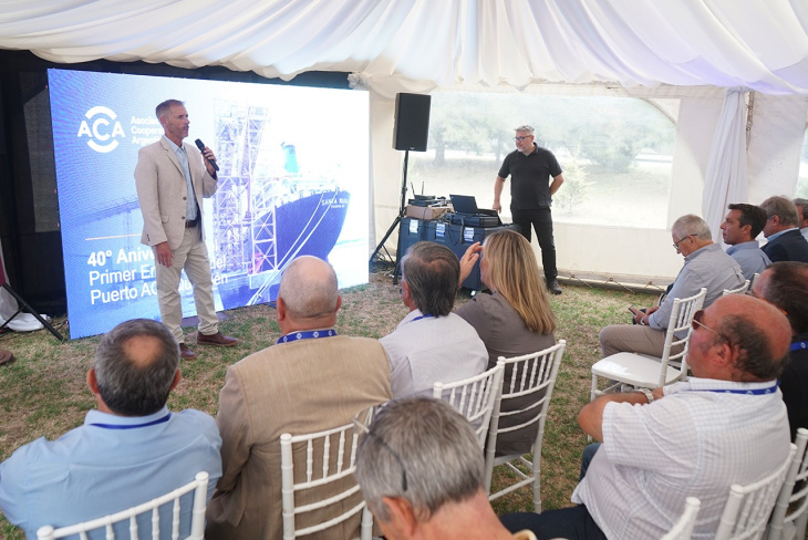 Durante la ceremonia oficial, las autoridades de la Asociación de Cooperativas Argentinas (ACA) dieron la bienvenida al mandatario local, quien estuvo acompañado por el secretario de Gobierno, Jorge Martínez, y el secretario de Turismo y Desarrollo Productivo, Matías Sierra. El encuentro incluyó una reseña histórica audiovisual y palabras alusivas de los representantes de la entidad cooperativa, quienes repasaron el crecimiento sostenido del puerto desde aquel primer embarque concretado el 29 de enero de 1986.