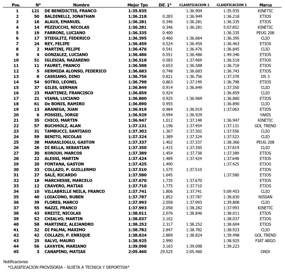 Con los tiempos obtenidos en la primera clasificación, Emanuel Alaux (Toyota Etios) y Nicolás Pezzucchi (Ford Fiesta Kinetic) se ordenaron 3º y 4º respectivamente, ambos a 0s346, ya que igualaron el tiempo. Luciano Farroni (Peugeot 208), que se había quedado sin tiempo en la primera tanda clasificatoria por una sanción de los comisarios deportivos, cerró el grupo de los 5 más rápidos, a 0s400 de De Benedictis.