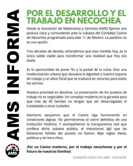 “Por un Casino moderno, por el trabajo necochense y por el futuro de nuestras familias”, concluye el comunicado de la AMS, que refleja el clima de preocupación creciente entre los trabajadores ante un posible nuevo freno a un proyecto que consideran clave para Necochea.