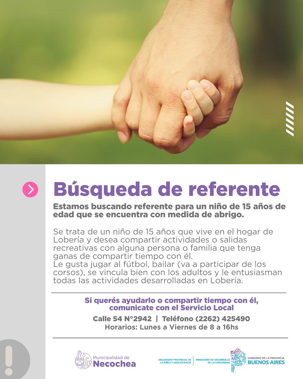 Asimismo, desde el Servicio Local indicaron que también se busca referente para un adolescente de 15 años que se encuentra con medida de abrigo. En este caso, también reside en el hogar de Lobería y manifiesta interés en compartir tiempo con alguna persona o familia que desee acompañarlo en actividades recreativas. Le gusta jugar al fútbol, bailar —participa de los corsos— y se vincula con facilidad con los adultos, mostrando entusiasmo por las actividades que realiza en la ciudad.
