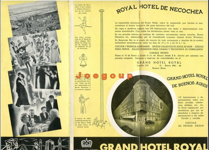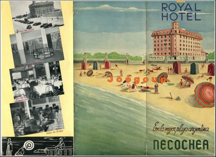 El material, de estética clásica y elegante, promociona al Royal Hotel de Necochea como uno de los grandes atractivos del balneario del sur bonaerense. Ubicado sobre la explanada frente al mar, el establecimiento se presentaba como un espacio moderno y distinguido, con más de 250 habitaciones equipadas con baño privado, teléfono, calefacción y comodidades de primer nivel para la época.