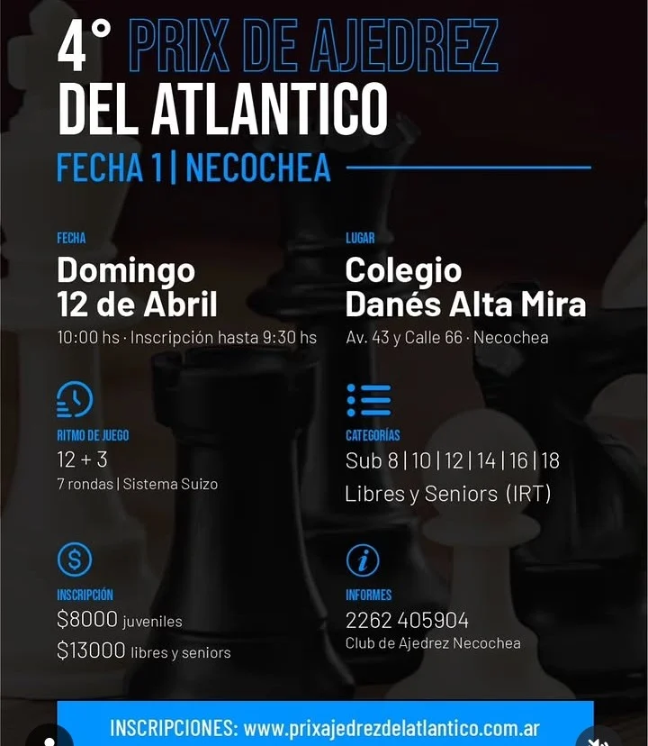 Pero el evento principal llegará el domingo 12 de abril, cuando Necochea será sede de la primera fecha del Prix del Atlántico 2026. La jornada comenzará a las 10 de la mañana y reunirá a ajedrecistas de distintos puntos del sudeste bonaerense.