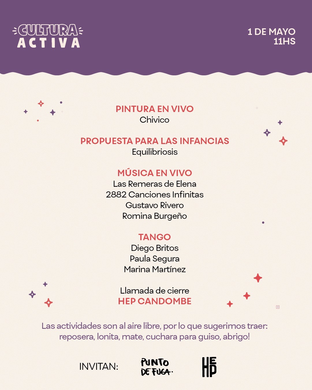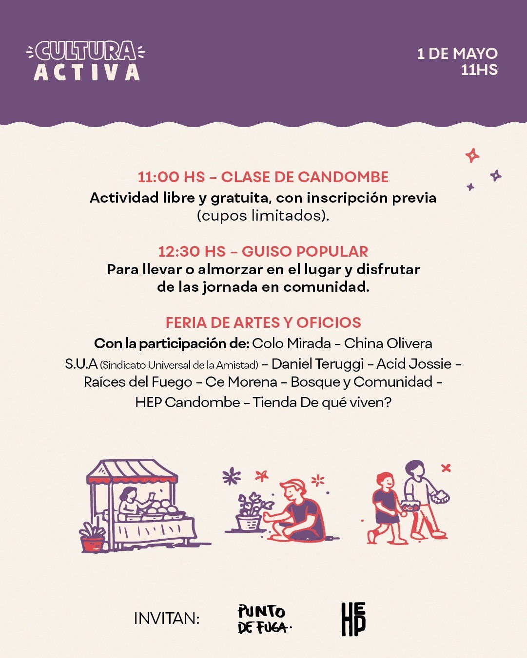 La actividad, coordinada de manera conjunta entre el CCMN, H.E.P Candombe y Punto de Fuga, comenzará desde la mañana con un almuerzo comunitario y continuará con diversas expresiones artísticas. Durante la jornada habrá presentaciones de candombe, intervenciones teatrales y una feria de artes visuales y oficios, entre otras propuestas pensadas para todas las edades.