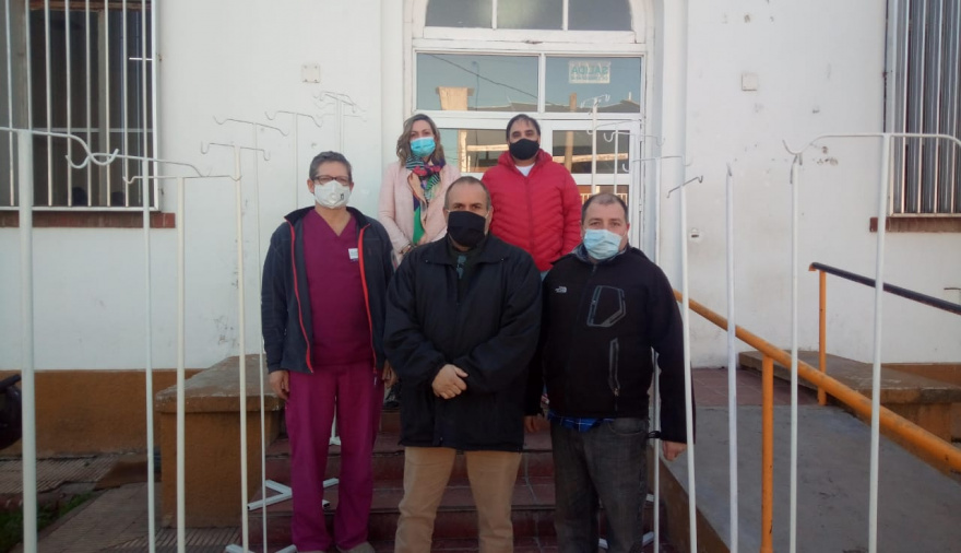 Alumnos del curso de Montador Electricista del Centro de Formación Laboral 403 donaron 18 pies portasueros al Hospital Irúrzun de Quequén. Los mismos fueron recibidos por el director del nosocomio, Nicolás Salguero, y la secretaria de Salud, Ruth Kalle.
